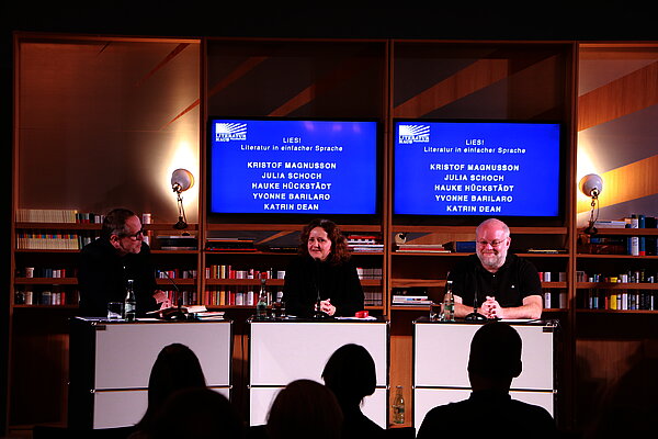 Foto zeigt Saskia Hennig von Lange, Hauke Hückstädt und Julia Schoch bei der Lesung im Literaturhaus.