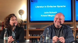 Teilhabe für alle soll überall möglich sein, auch in der Kultur. Acht namhafte Autoren schreiben neue Geschichten in Einfacher Sprache. Einfache Sprache als Kunstform! Am Am 6. Dezember 2018 fand im Literaturhaus wieder eine Lesung mit zwei Autoren statt:  Julia Schoch und Kristof Magnusson.
