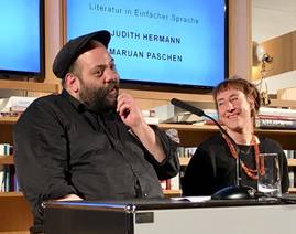 Frau Stadträtin Prof. Dr. Birkenfeld und Literaturhausleiter Hauke Hückstädt freuten sich am 27. März 2019, erneut 150 Besucherinnen und Besucher zu begrüßen. Und natürlich die bekannten Autoren Judith Hermann und Maruan Paschen, die im Literaturhaus ihre Texte in Einfacher Sprache lasen. Das Publikum war begeistert. Wieder war es ein spannender und vergnüglicher Abend, mit der Gelegenheit, sich nach der Lesung mit den Autoren auszutauschen.